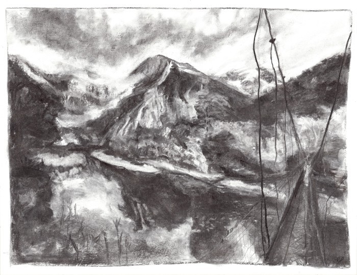 Paysage Milford Sound, fusain sur papier, 65 × 50 cm (2018)